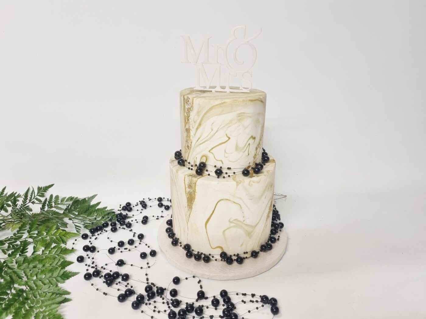 These black pearls on silver wire make an excellent affordable cake decoration weather it be for a wedding or baby shower. This strand is 130cm in length and each of the pearl can be spaced out to reach your desired look. We have used just 1 strand in this image.